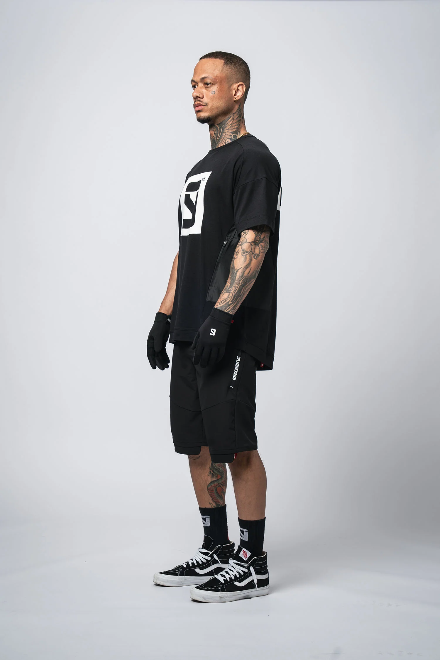 Logo-Print an der rechten Oberschenkelrückseite und funktionell eingebrachte Seiten- und Oberschenkeltaschen.