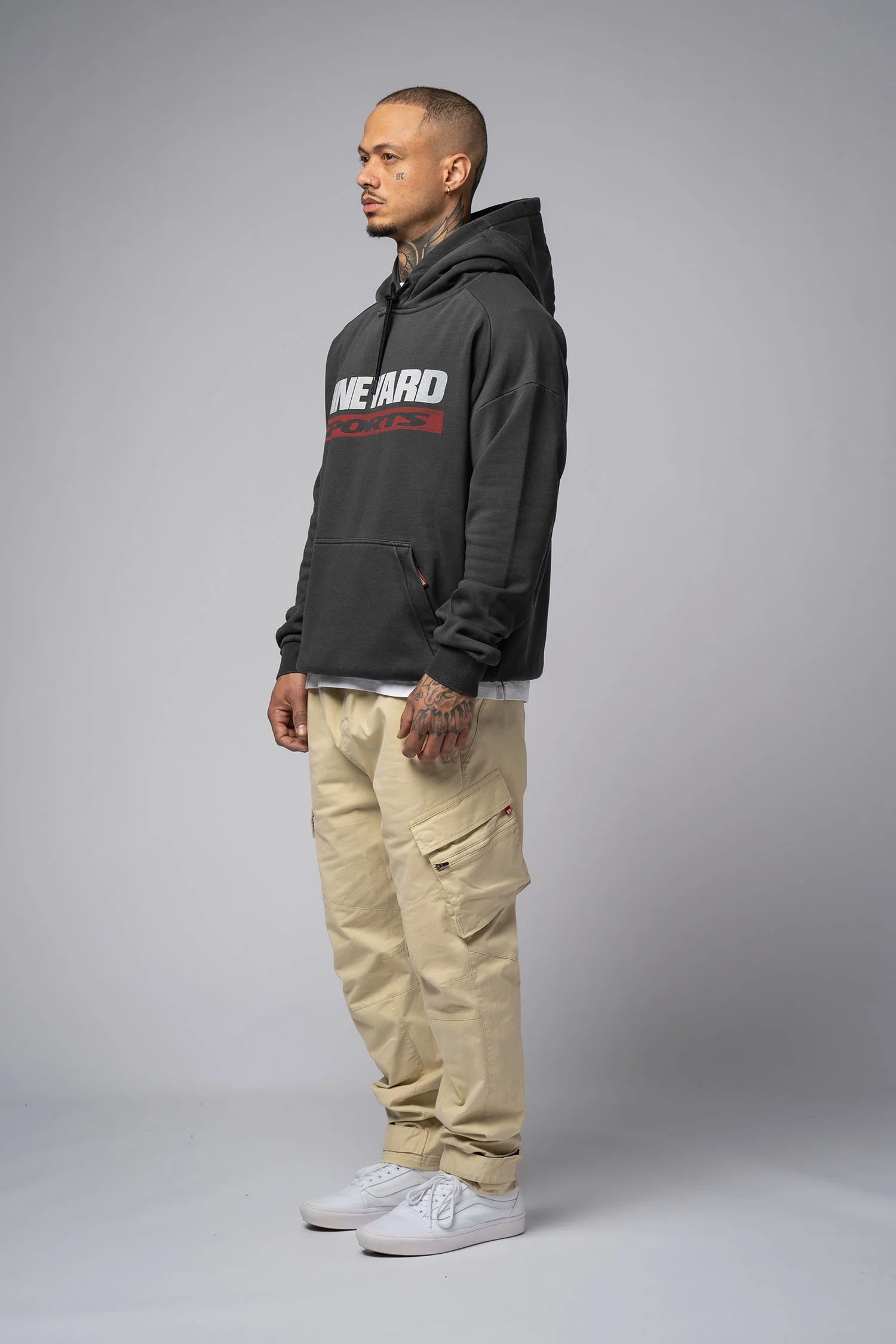 Sports Hoodie mit aufwendiger used Waschung, Druckapplikationen auf Brust und Rücken. Die doppellagige Kapuze ist am Kopf und Hals fixierbar und schützt vor Wind und Kälte. Aufgesetzte Fronttasche mit verdeckten Reißverschlüssen.